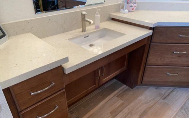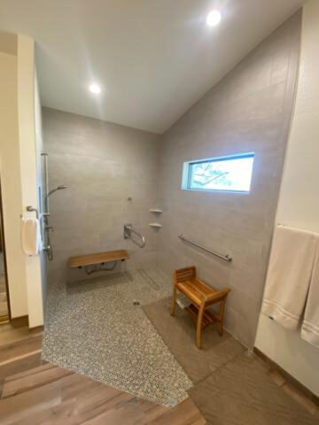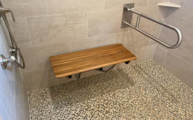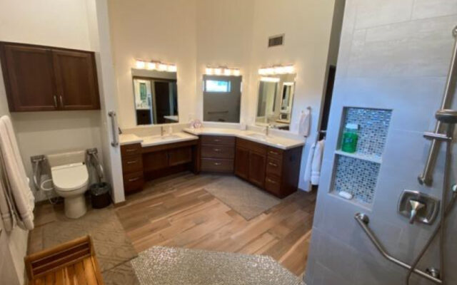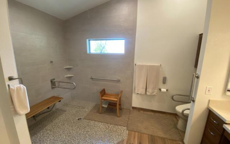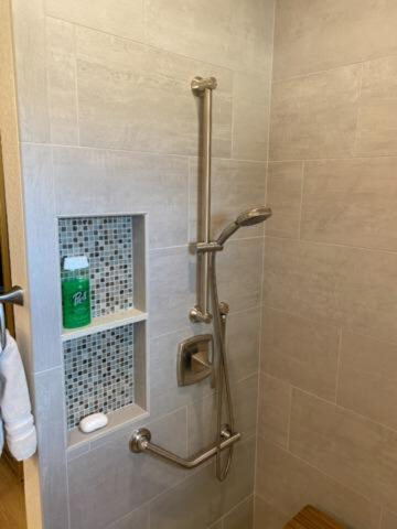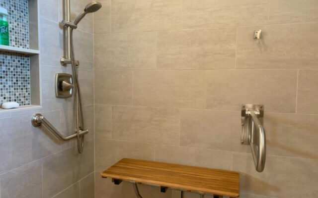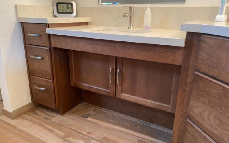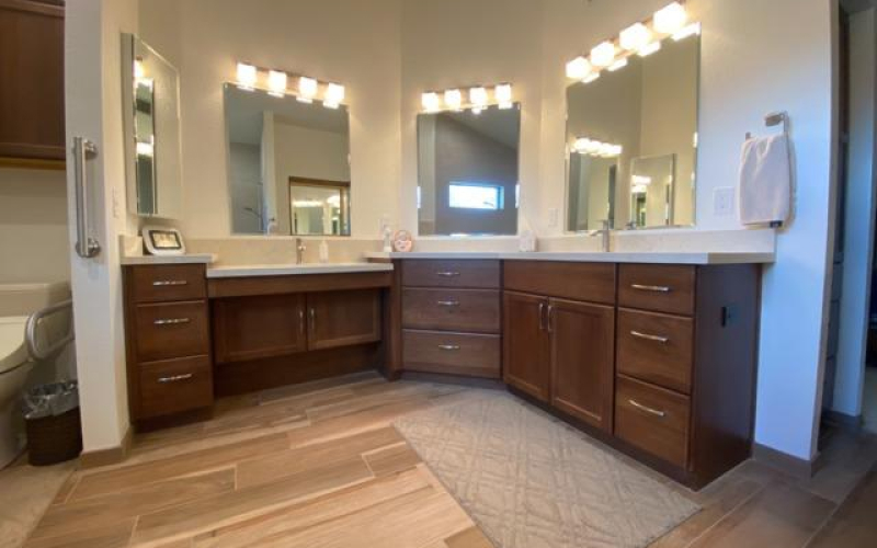 This homeowner needed to make his bathroom wheelchair accessible. We were able to open up the existing water closet and remove the tub for an open floor plan with a large, beach entry shower that is easy to maneuver. You will also notice that an area of vanity is recessed and lowered for wheelchair accessibility. The designer, Todd Raisanen, is Certified Aging-in-Place (CAPS) through the National Association of Home Builders.