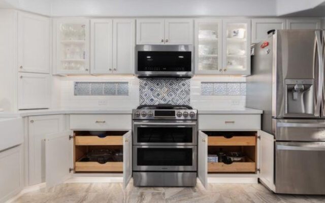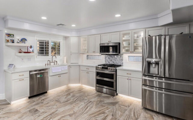 These homeowners called TraVek Remodeling & Roofing initially because they wanted to update their kitchen. They had lived there for many years and had been considering a remodel for approximately four years. The cabinetry was very dark and dated. They were looking for more of a contemporary look. They wanted to remove the L-shaped peninsula in the kitchen and add a center island. They also wanted to remove a couple of walls and open up the staircase and upstairs landing. As you can see, it’s beautiful, airy, and light.