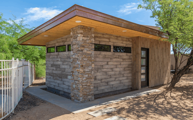 Originally, this was an old, dilapidated shed, and a perfect spot for something more attractive! Look at the transformation of the old shed to what is now a sauna and bunkhouse. This was meticulously designed, and every line and texture have a certain purpose. Some of the lines and products are an extension of the main house. You’ll see that there are some walls at an angle. Same with the roof lines. That, too, is purposeful.