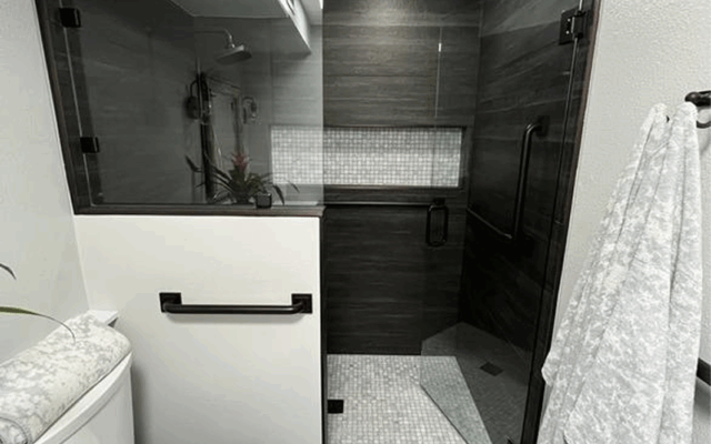 This homeowner was dealing with health issues, making getting in and out of a shower/tub combo increasingly difficult. We were able to convert to a walk-in shower and even take some space from a closet on the other side of the wall to create a spacious, stylish curbless shower.